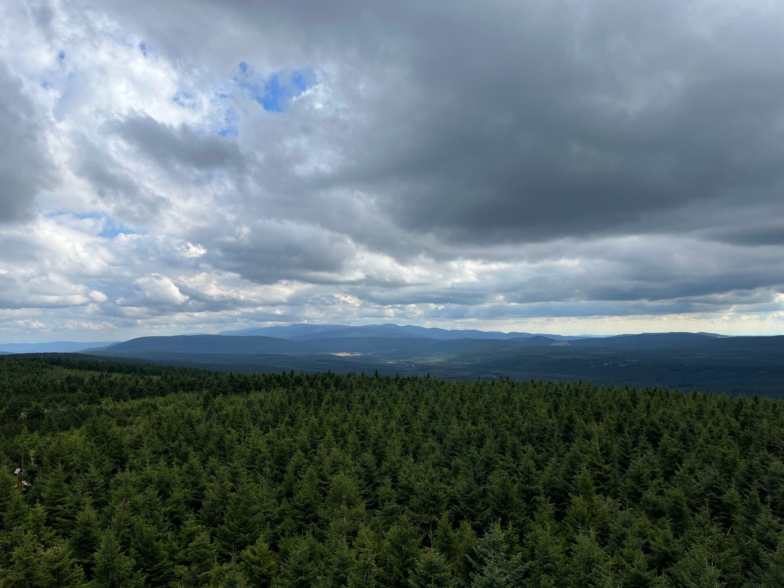 Náš další významný milník k dosažení je rozhledna Smrk. Ta nabízí výhled do široké krajiny. Lze vidět horu Říp, Jizeru, ale i Sněžku. Druhým dechem je nutno zmínit, že vyšlápnout na horu není zadarmo. Respektive je, ale platí se vynaložením většího množství energie. Cesta je kamenitá, rozbitá a sklony jsou brutální. Místy je nutno kolo i tlačit. Ale ty výhledy…