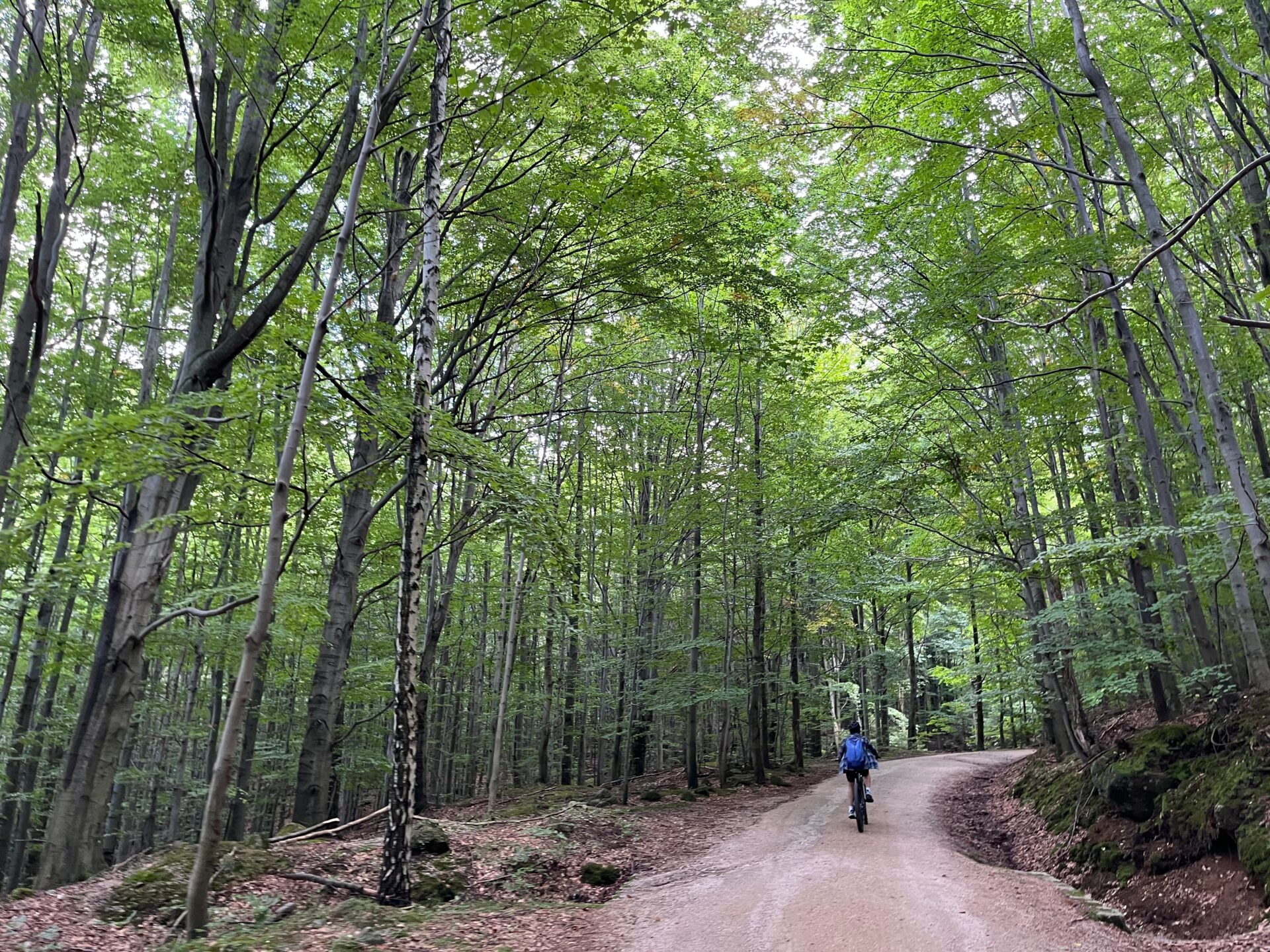 Sjezd ovšem chutnal. Opět nás doprovázel krásný lesní porost, výhledy, samoty. Parádní jízda.