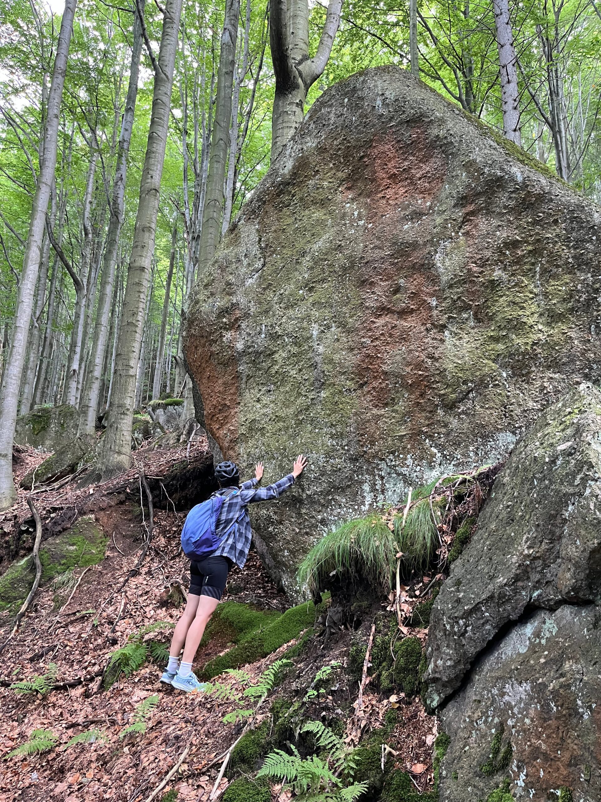 Kromě ohromných buků zde stojí i veliké balvany. Stojí jako přibitej, ani Alyonka s ním nepohne.